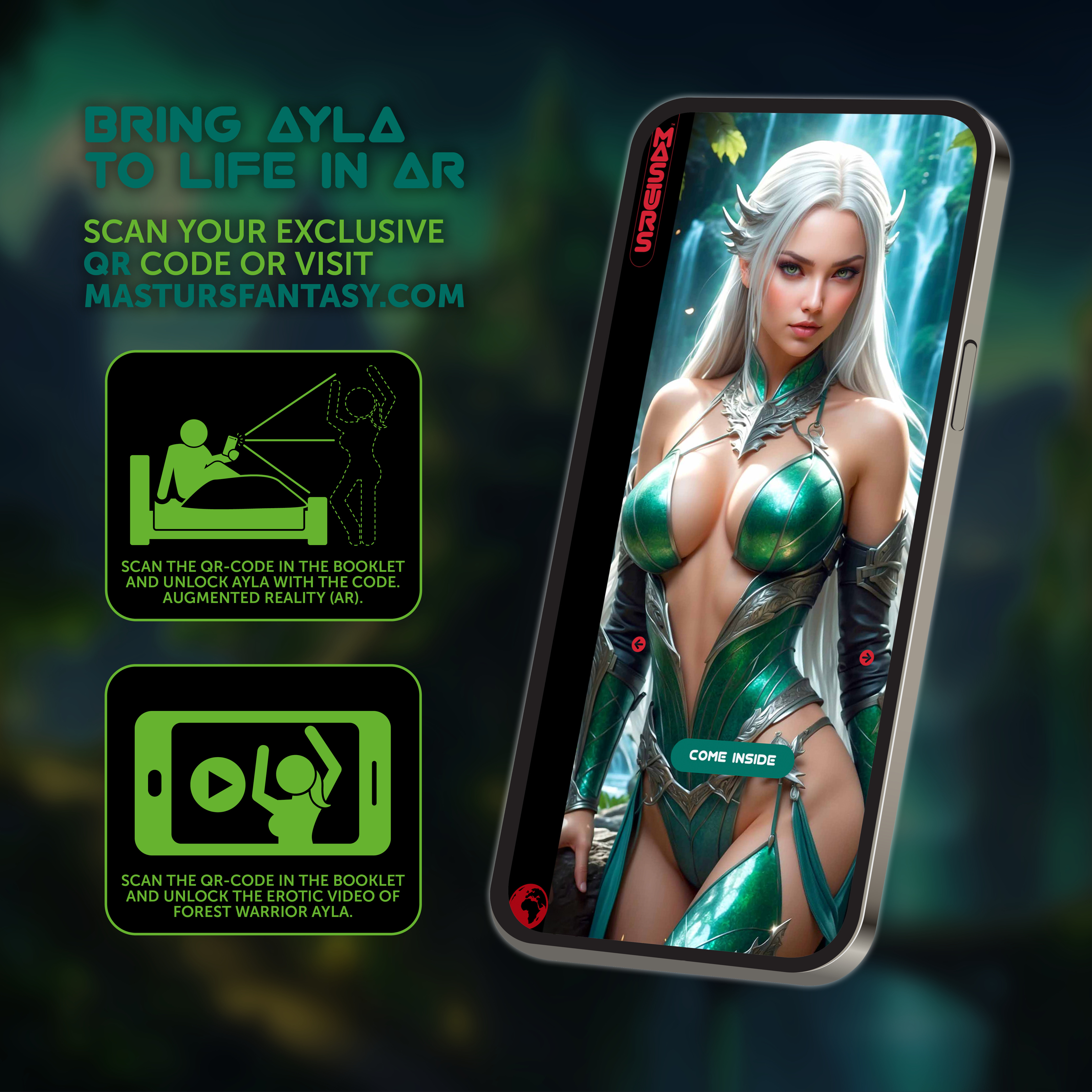 The booklet inside the packaging contains QR codes and a unique code to guide you to Raven’s world! Choose between a Augmented Reality (AR) experience or a naughty erotic movie!